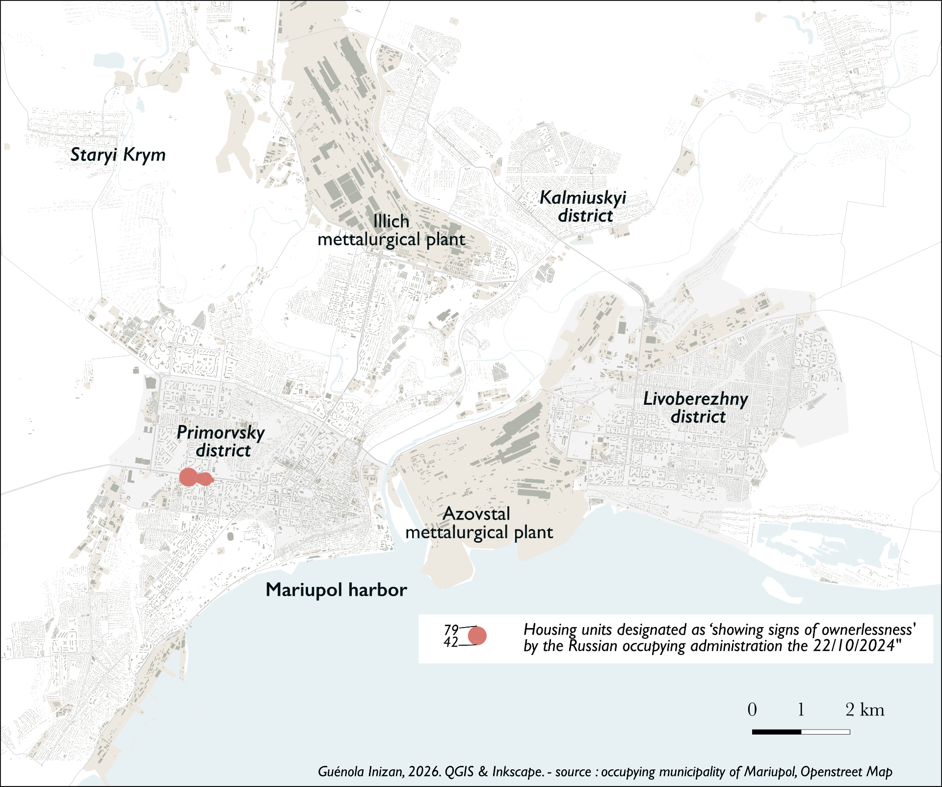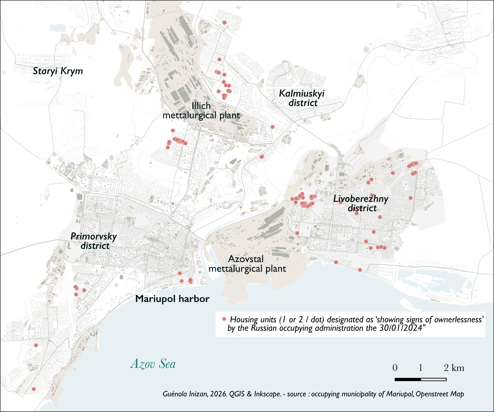 Using mapping to visualise lists of dwellings declared “ownerless” in the occupied areas of Ukraine, the case shows how administrative records can reveal patterns of dispossession. By mapping fragmented datasets (such as in Mariupol, where about 11% of surviving housing appears to have been "municipalised") it exposes how a technical process functions as a territorial strategy for reassigning property while obscuring how buildings are labeled “abandoned.”