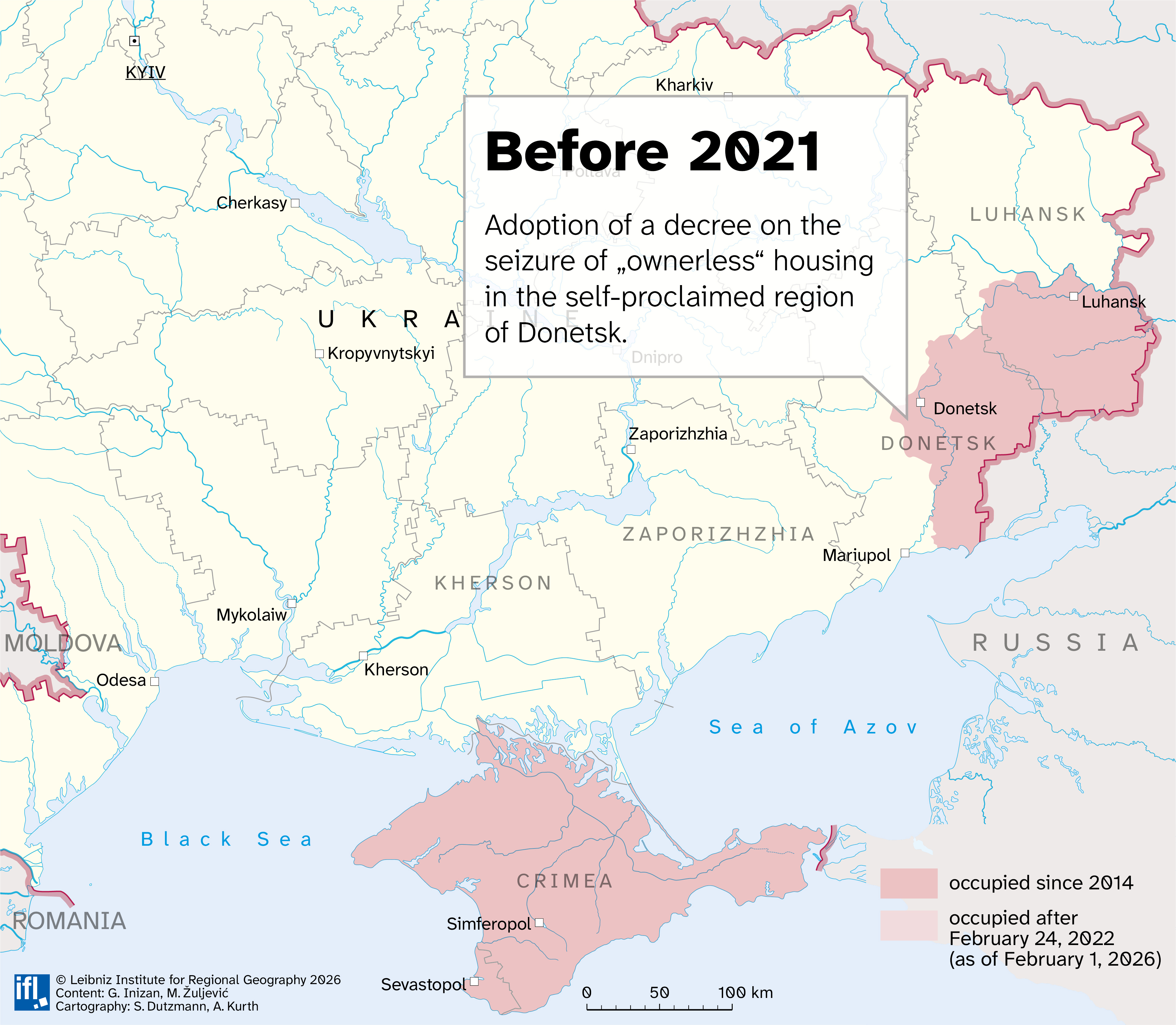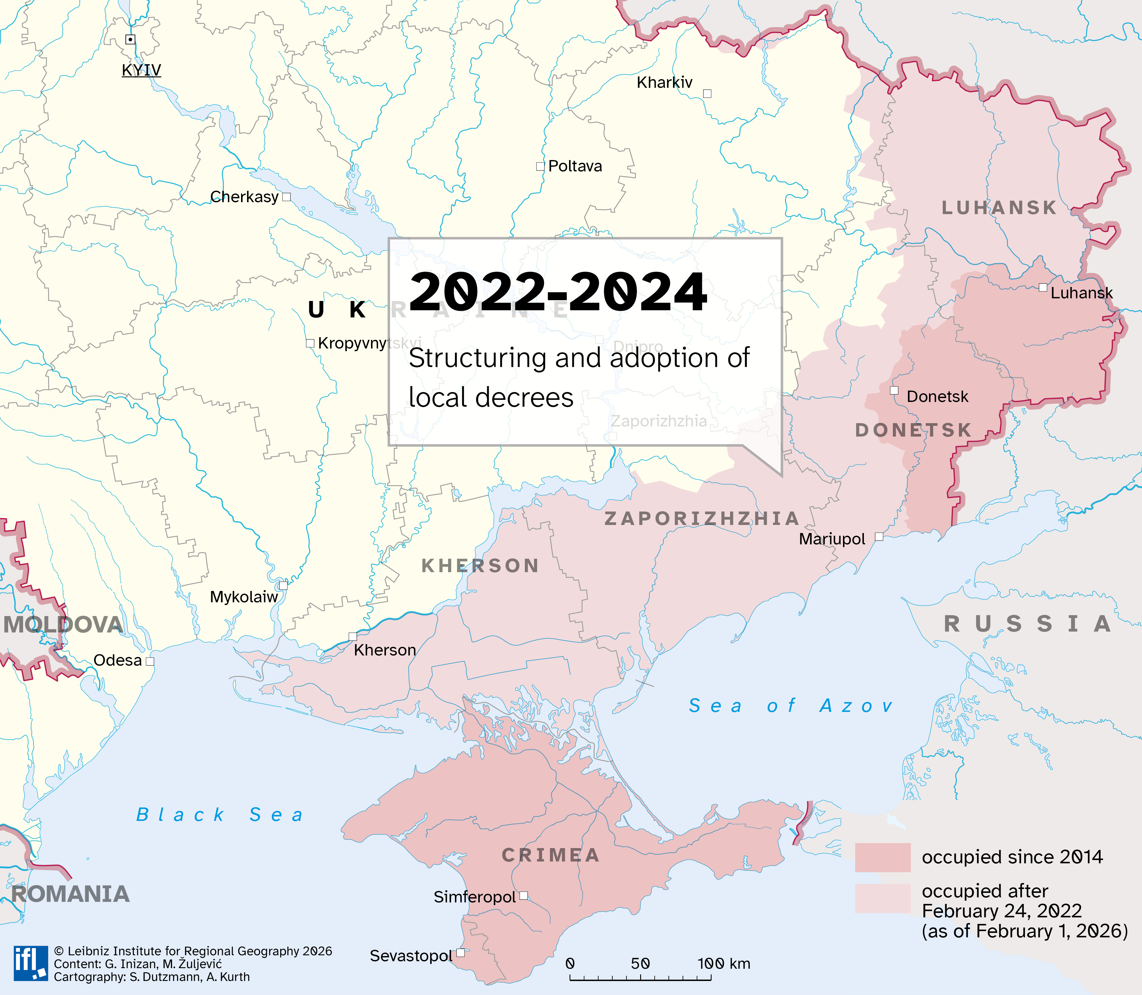 Guénola: This map illustrates a common strategy of Russian authorities, both inside and, as in this case, outside Russia’s acknowledged borders: legalizing crimes in order to legitimize them. It aims to show how the adoption of pseudo “legal” texts constitutes one weapon among others used to appropriate a territory that is controlled de facto but illegally under the international legal framework.
