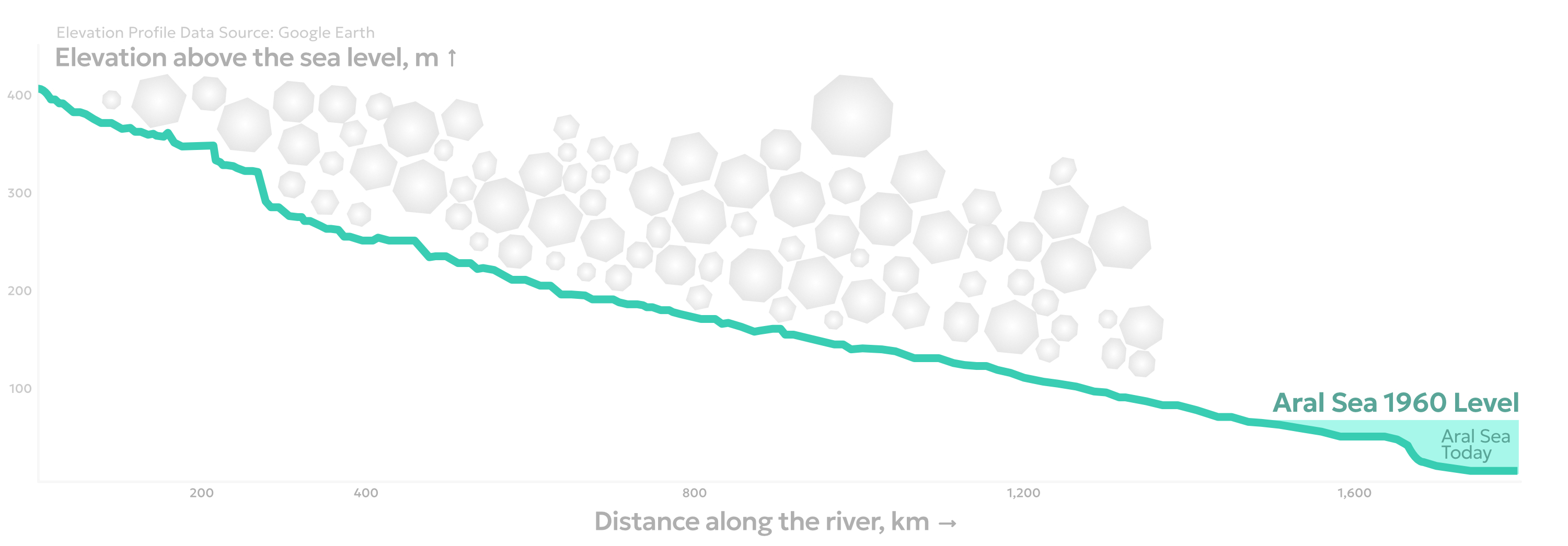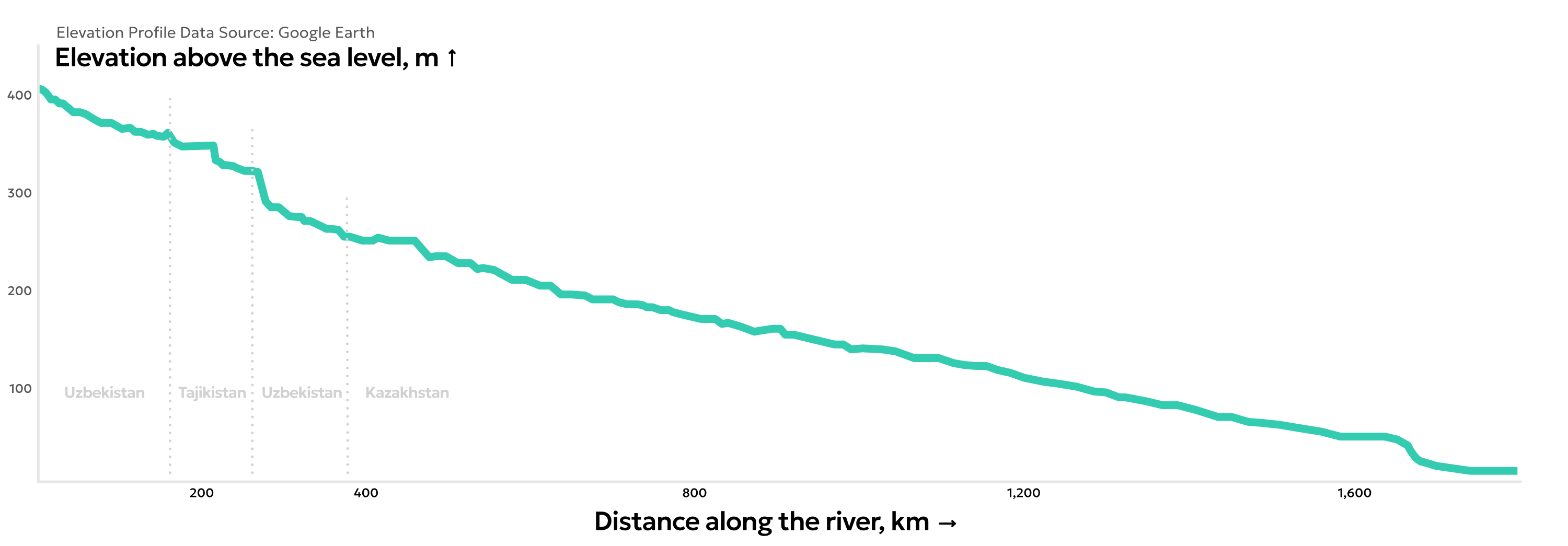 Iaroslav: A river profile as the visualization method was somewhat a compromise on finding a way to uniquely focus the entire visual narrative on the Syr Darya itself. Its basin occupies a very complex spatial setting of Central Asia. Originating in the mountains and crossing multiple borders, the river might be perceived primarily as a result of political divisions. What method would keep the focus strictly on the river? Thanks to my bachelor times, I recalled the practice of constructing geographic profiles which served as a very specific analytical mapping technique. River profiles, in particular, give an immediate insight into the vertical\horizontal dynamic of the mainstream. Such an underrated method seemed entirely appropriate. We can clearly see the scale of the river, how steadily and evenly it extends across hundreds of kilometers, and at the same time how different states control it all the way to its mouth in the Aral Sea. Ultimately, a river is a product of climate interacting with terrain. In this sense, the profile gives proper attention to the river itself and may represent one of the most ultimate — and politically neutral — forms of its visualization.