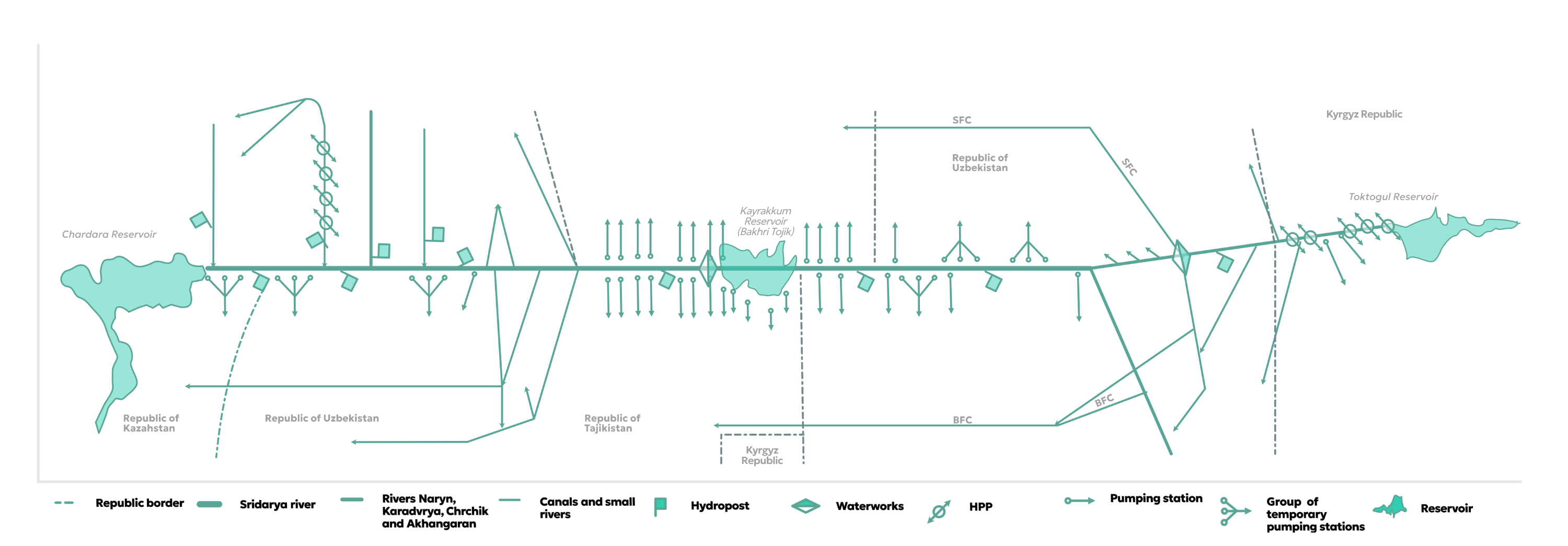 Nafisa: The illustration was intended to question the simplified formulation of upstream-downstream water conflict, as the asymmetry within the river basins is multidirectional rather than linear. For example, Uzbekistan has both upstream and downstream positions along the Syr Darya, influencing certain stretches of the river while remaining dependent in others. This perspective is further illustrated by this diagram (the reproduced version of the old scheme I found in Dushanbe) that emphasises the system's structural complexity. Here, the system itself is seen as part of the problem. Following the dissolution of the Soviet Union, political authority was rescaled along newly established national borders, but the integrated hydraulic infrastructure remained mostly unchanged. The misalignment between political sovereignty and hydrological interdependence is argued to be the structural condition that continues to shape transboundary water governance in Central Asia.