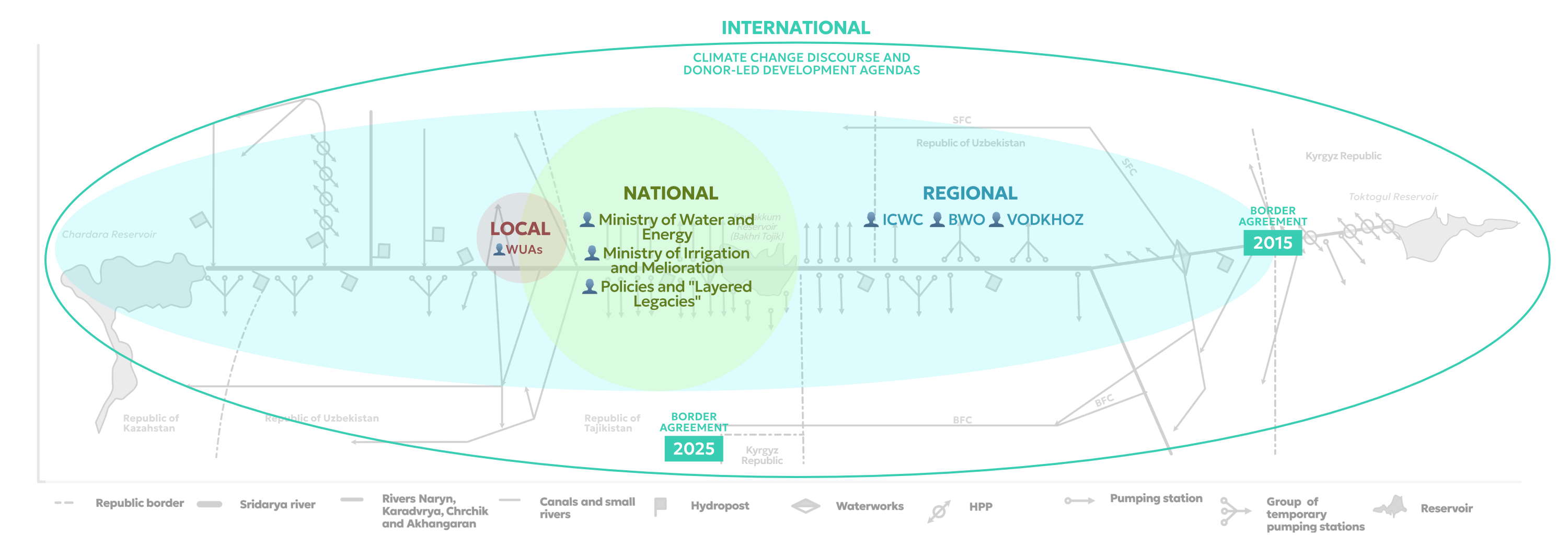 The Fergana Valley's extensive network of canals, reservoirs, and pumping stations, initially engineered for tightly centralised management, now spans multiple national borders and is increasingly fragmented. This network is not only responsible for irrigation but is also closely tied to hydropower generation, which requires coordinated control of seasonal water releases. As a result, water allocation is entangled with energy needs, reinforcing competing claims and intensifying the flow regulation. In addition, environmental degradation and high evaporation increase water scarcity by reducing the overall efficiency of the system.