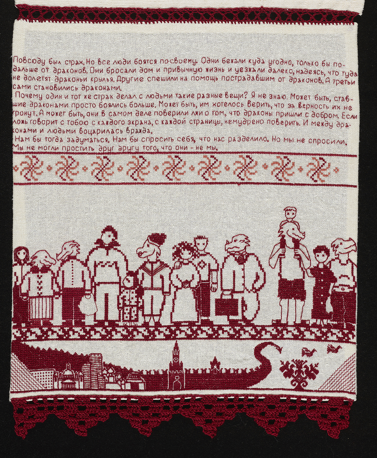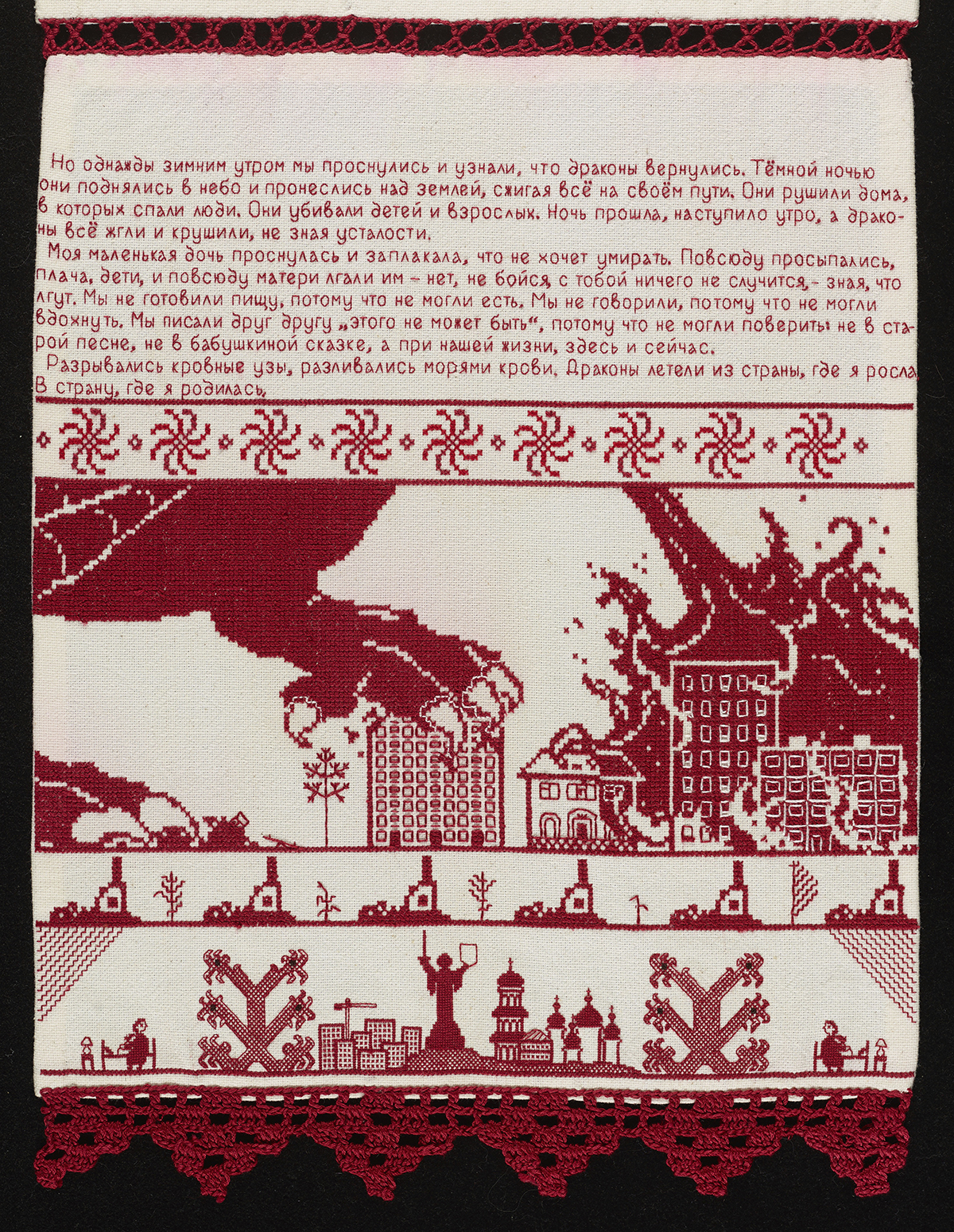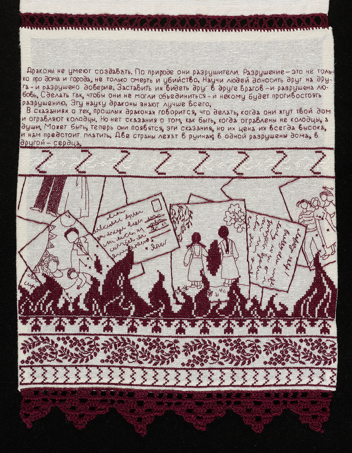 When Dragons Came: A Story in Three Rushnyks continues both the tradition and further transformation of the rushnyk. It explores greater narrativity by using embroidery as a means to tell the story of the war between Russia and Ukraine and the societal changes that arose from this war. The project weaves in personal stories and memories of the author, and her Russian and Ukrainian grandmothers. The narrative component intertwines with traditional symbolism, with the central image being that of a dragon, which in Slavic mythology is associated with destruction and war.