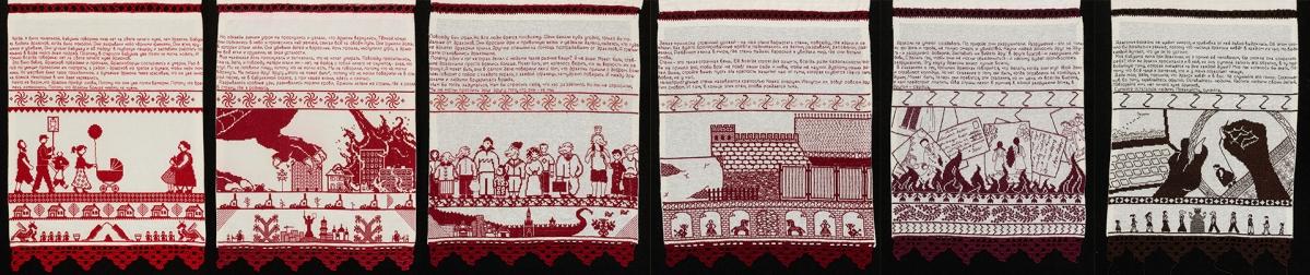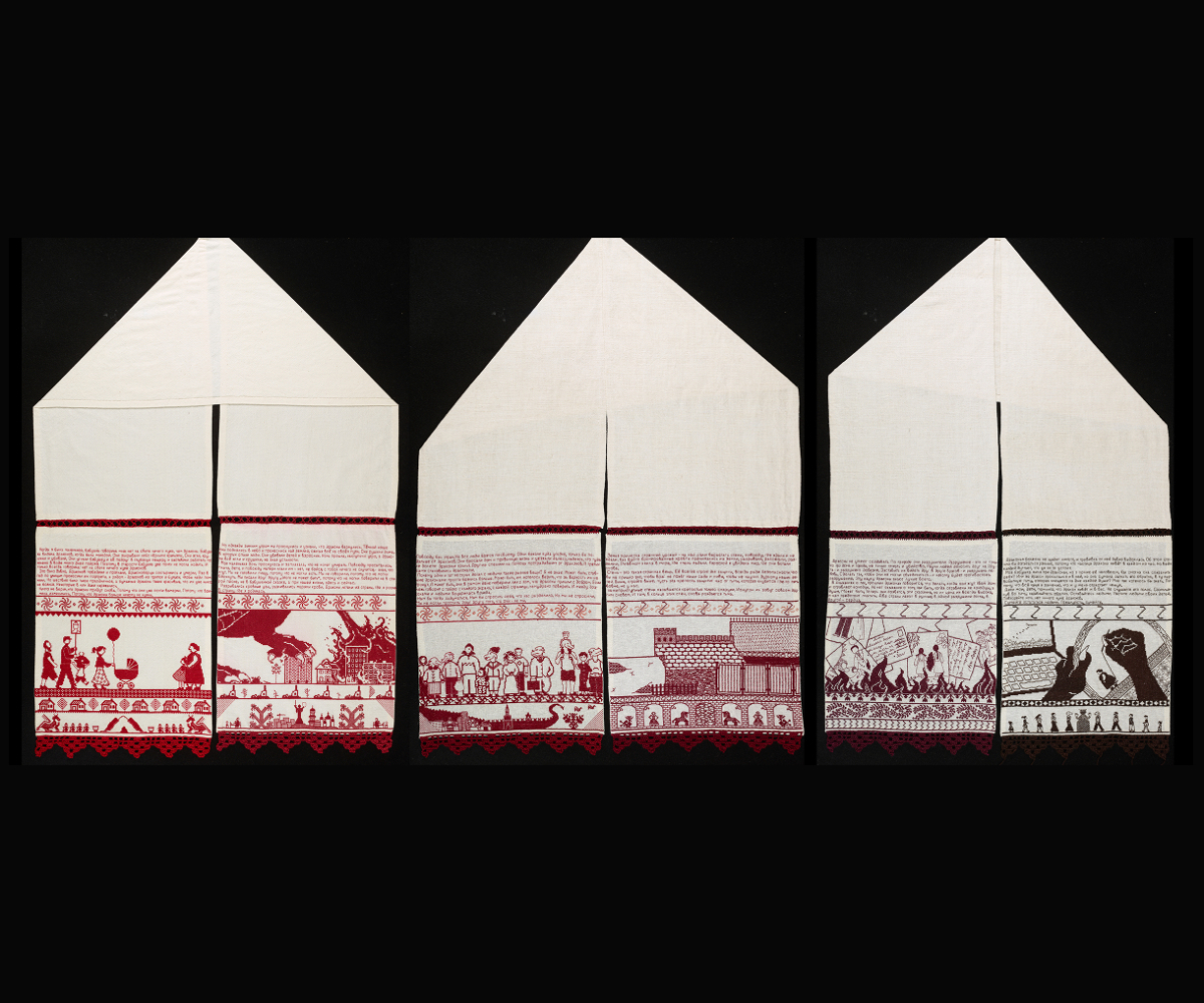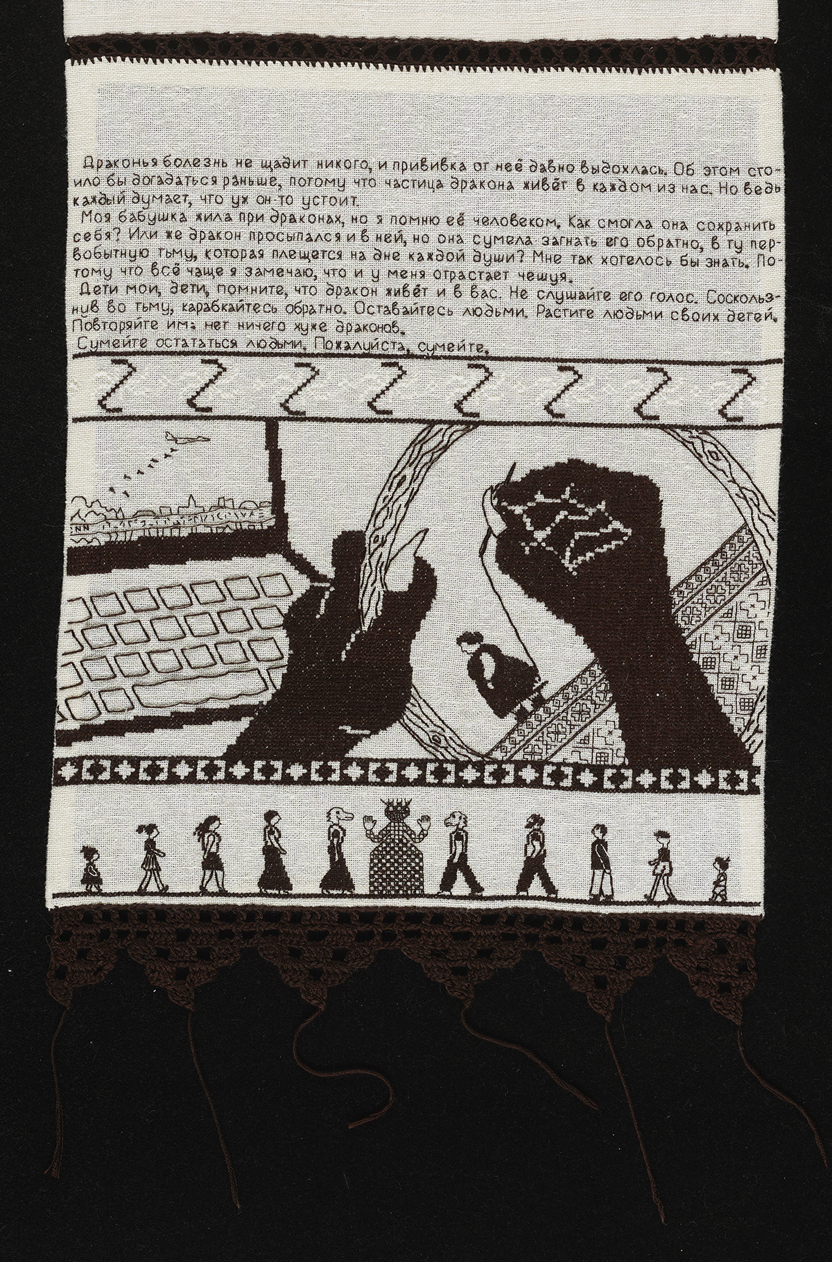 When Dragons Came: A Story in Three Rushnyks continues both the tradition and further transformation of the rushnyk. It explores greater narrativity by using embroidery as a means to tell the story of the war between Russia and Ukraine and the societal changes that arose from this war. The project weaves in personal stories and memories of the author, and her Russian and Ukrainian grandmothers. The narrative component intertwines with traditional symbolism, with the central image being that of a dragon, which in Slavic mythology is associated with destruction and war.